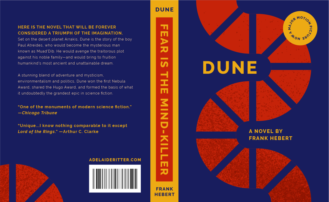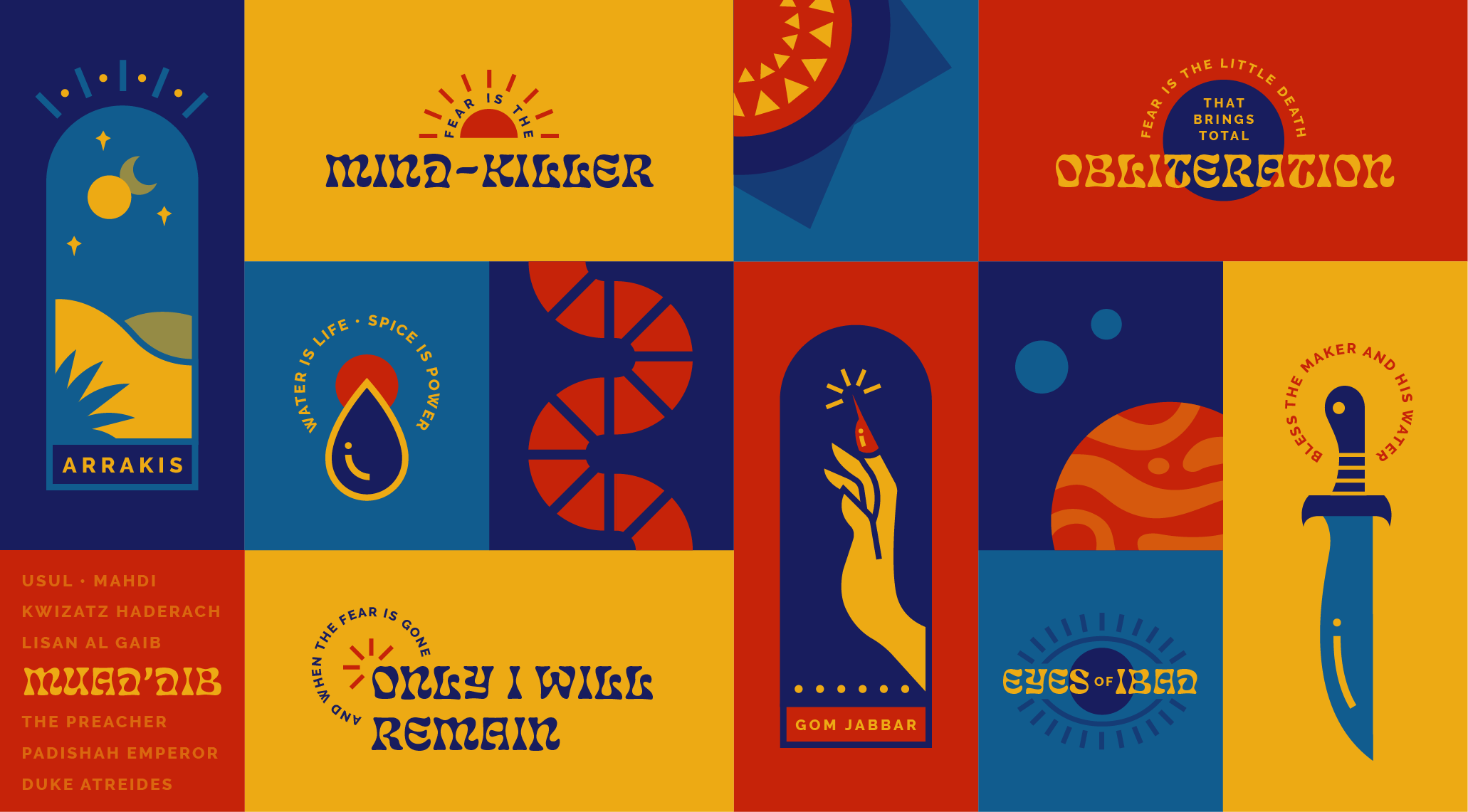 My most recent passion project is a series based on the sci-fi classic novel Dune, heavily featuring type and vector illustration styles that are a departure from my traditional work. Dune is iconic for sweeping alien landscapes of endless desert, the perfect backdrop for its characteristic balance of tragedy, philosophy, and political intrigue. It’s also evocative of the classic 60’s and 70’s-era age of high science fiction, distinguished by its epic world-building and distinctive Islamic influence. I brought these unique qualities to life with bold, contrasting colors and chunky retro type (chosen to evoke an early-edition cover from my first copy of the novel).